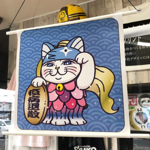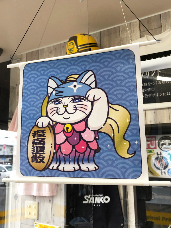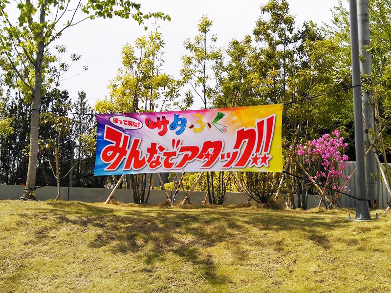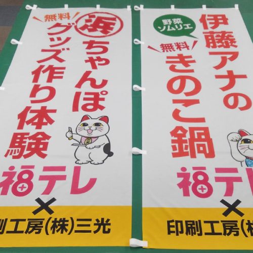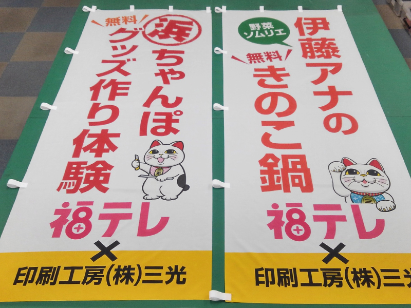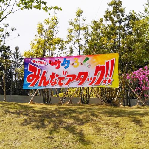 転写紙にインクジェットでカラー印刷してから、布地に熱で転写します。ポンジなど薄い生地は裏側まで染色できます(裏抜け)。水や雨に強く、一枚からフルカラーで制作可能です。屋内外のぼり旗、バナー、タペストリーは、やわらかい風合いのある仕上がりに。横断幕、応援旗、懸垂幕も、発色がいいのでとても喜ばれております。